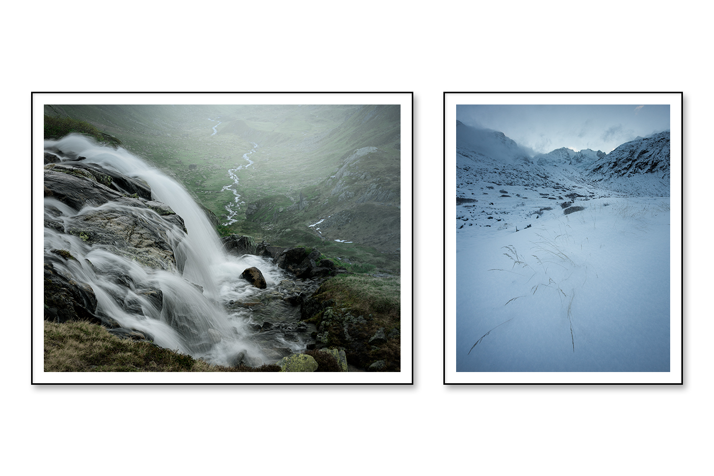 Die Serie zeigt die Berge in ihrer rohen, stillen Präsenz: Wasser, Fels, Schnee und Nebel formen eine Landschaft fernab von Idylle. Raues Wetter, gedämpftes Licht und reduzierte Farben lassen die ursprüngliche Kraft der Natur spürbar werden. Es sind Momente, die sich dem flüchtigen Blick entziehen und die Berge als zeitlose, unberührte Wesen offenbaren.