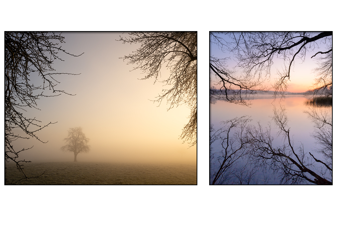 Äste formen einen stillen Rahmen und öffnen den Blick auf zwei Welten des Morgens. Ein einzelner Baum ruht im Nebel und im warmen Morgenlicht, während Wasser, Schilf und Dunst in Blau und Rot leise ineinanderfließen. Beide Bilder erzählen von Übergängen, von Ruhe und dem sanften Erwachen der Natur.