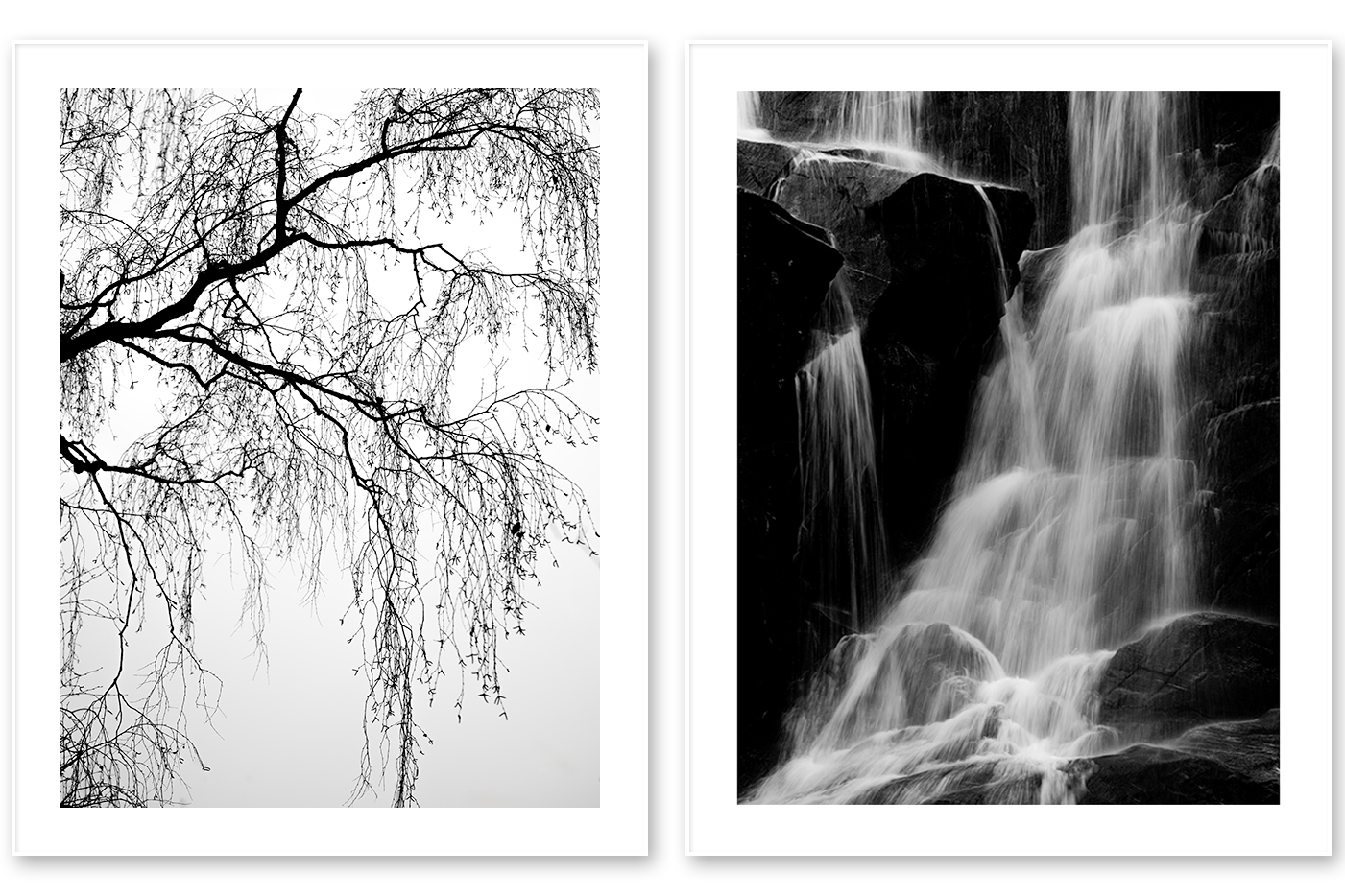 Ein ästhetischer Birkenast wächst filigran von links ins Bild vor einem hellen, nebelverhangenen See, seine zarten Blüten wirken verspielt und leicht. Im zweiten Bild stürzt Licht in Form von Wasser über dunkle Steine, während die Schwere der Felsen die Bewegung sanft umrahmt. Gemeinsam erzählen die Fotografien von Vergänglichkeit und Erneuerung, vom leisen Spiel zwischen Ruhe und Kraft.
