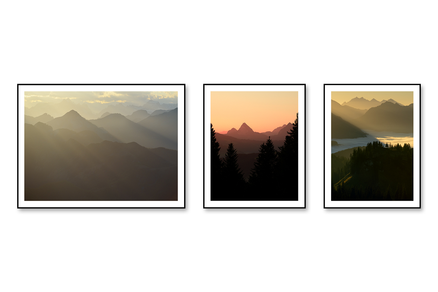Die Berglandschaft liegt im Dunst, Farben überlagern sich in sanften Schichten und werden vom Licht weich geführt. Warme Pastelltöne lösen klare Konturen auf und verleihen der Szene eine malerische Ruhe. Die drei Fotografien bilden gemeinsam eine stille Abfolge aus Raum, Farbe und Licht.