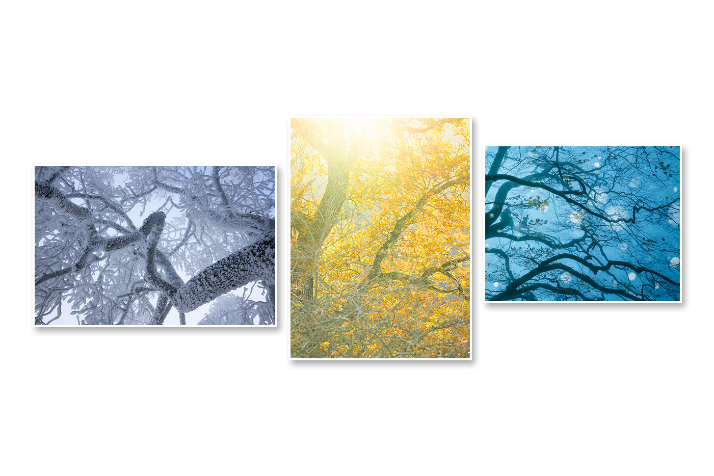 Drei geschwungene Äste treten nacheinander ins Licht: erst kühl vom Reif umhüllt, dann vom warmen Sonnenblick berührt, schliesslich vom kalten Regen verdunkelt. In ihrer stillen Abfolge entsteht der Eindruck eines einzigen Baumes, der Zeit atmet und doch aus drei Wesen besteht. Vergänglichkeit und Erneuerung berühren sich lautlos im Spiel der Jahresgefühle.